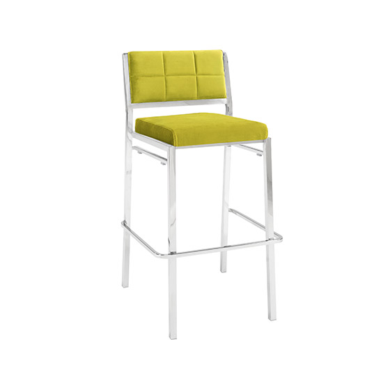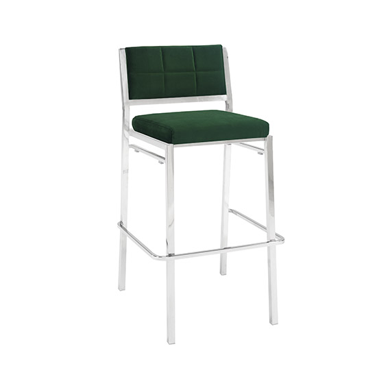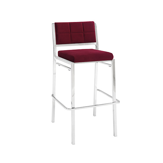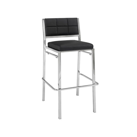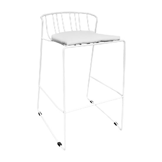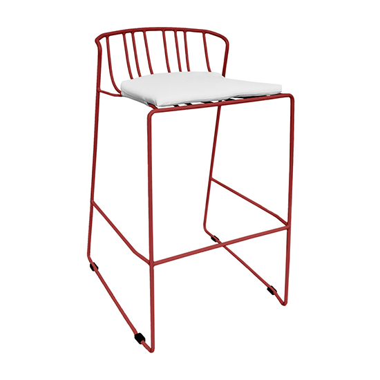 Elegant bar stool with plush 100% acrylic Sunbrella fabric seating pad features sturdy, lightweight powder-coated steel in a sleek and classic black finish. Simple and versatile modern look. Perfect for indoor or outdoor use. Available in White, Black, or Red.